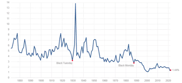 Dividend Yields Since 1870,5.5% down to 1.44% today.